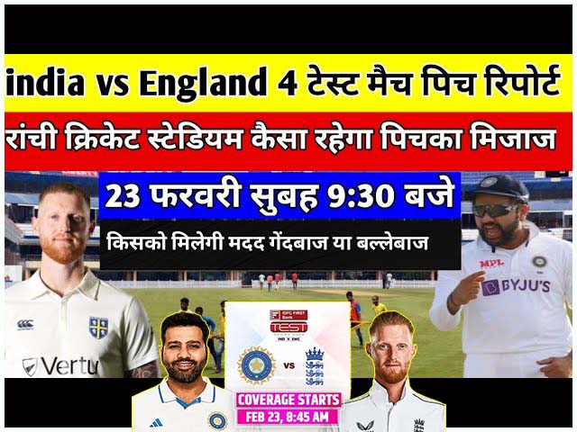 IND Vs ENG 4TH Test: 23 फरवरी से भारत और इंग्लैंड (IND Vs ENG) के बीच खेले जाने वाले चौथे टेस्ट मैच में पहले बल्लेबाजी करने वाली टीम का पलड़ा भारी रहेगा। यानी जो टीम टास जीतेगी वो पहले बल्लेबाजी करने का निर्णय लेने में नहीं हिचकेगी। यह मुकाबला सेंटर पिच पर खेला जाएगा और पहले दिन लंच से पहले तक तेज गेंदबाजों को मदद मिलने की संभावना है। भारत और इंग्लैंड के बीच चौथे टेस्ट के लिए दोनों टीमें रांची (Ranchi) पहुँच गई जहां पर भारत- इंग्लैंड की टीमें आज से अभ्यास करेंगी