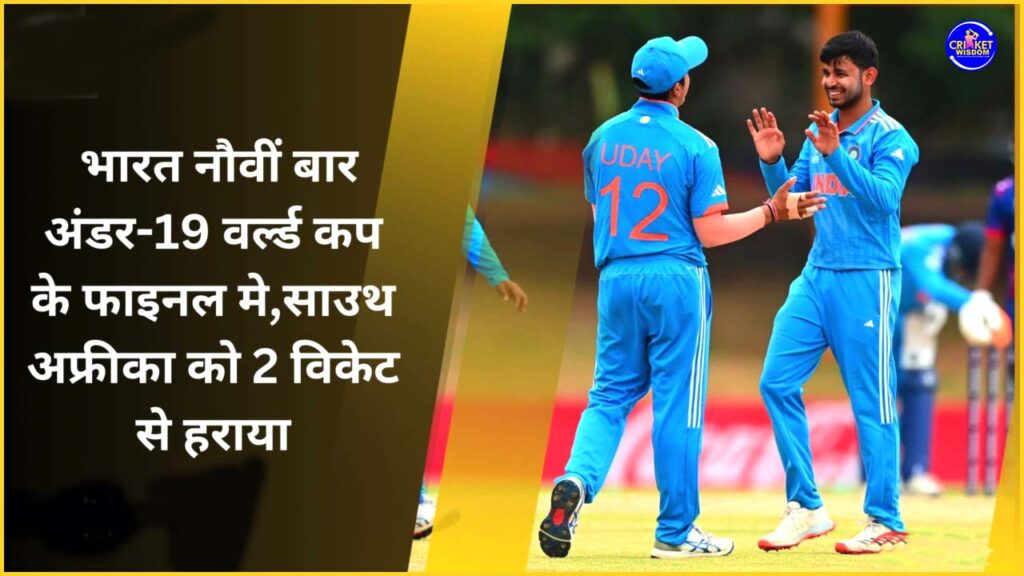 IND Vs SA U19 Semi Final: भारतीय टीम (Indian Team) ने साउथ अफ्रीका (South Africa) की टीम को आईसीसी अन्डर 19 वर्ल्ड कप 2024 (ICC U-19 World Cup 2024) के सेमीफाइनल मैच में 2 विकेट से हराकर फाइनल में प्रवेश कर लिया। भारत ने इस जीत के साथ ही 9वीं बार अंडर19 विश्व कप (U-19 World Cup) के फाइनल मैच मे प्रवेश किया। इस मैच में कप्तान उदय सहारन और सचिन दास ने शानदार बल्लेबाजी का प्रदर्शन करते हुए भारत (India) को ये जीत दिलाई।